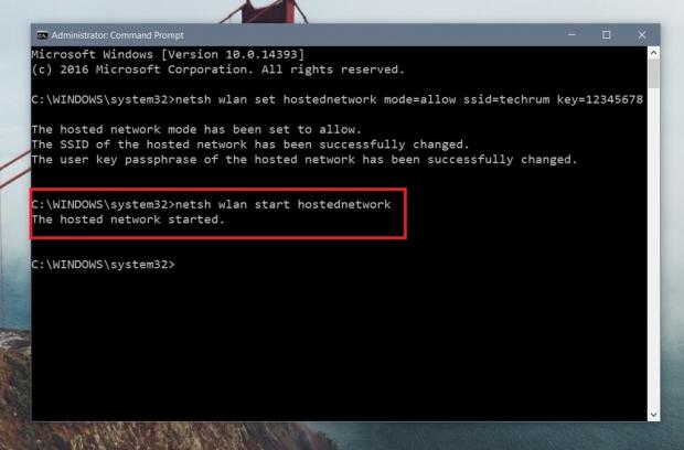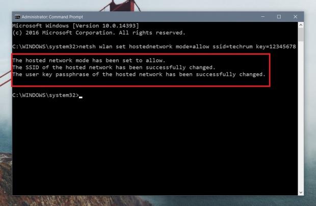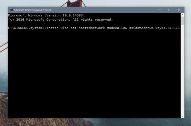 netsh wlan set hostednetwork mode=allow ssid=techrum key=12345678