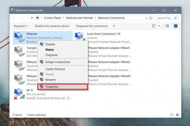 Bước 4: Vào Control Panel > Network and Internet > Network and Sharing Center > Change adapter settings. Nhấp chuột phải vào card mạng mà bạn muốn dùng để chia sẻ Wi-Fi, rồi chọn Properties (nếu đang dùng mạng dây thì chọn card mạng dây Ethernet, nếu đang xài Wi-Fi thì chọn card mạng Wi-Fi).
