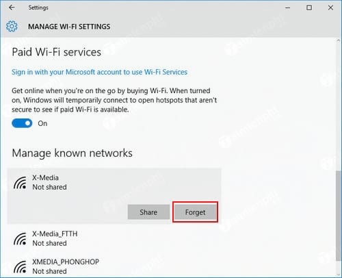 Bước 3: Tiếp theo, tại cửa sổ mới các bạn kéo xuống dưới và nhấp chuột trái vào tên kết nối wifi đã thay đổi mật khẩu và bấm vào Forget