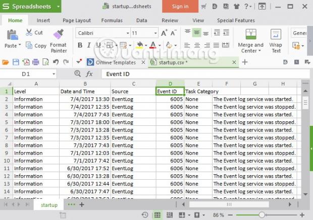 Bây giờ bạn có thể mở file CSV đã lưu bên trên để kiểm tra lại toàn bộ lịch sử bật và mở máy tính Windows. Trong tài liệu này, người dùng có thể thấy rõ hoạt động bật, mở máy ở từng ngày cũng như thời gian chi tiết cho các hành động đó. Ngoài ra, chúng ta có thể tiến hành chỉnh sửa, gửi file nhật ký này như với file tài liệu thông thường.