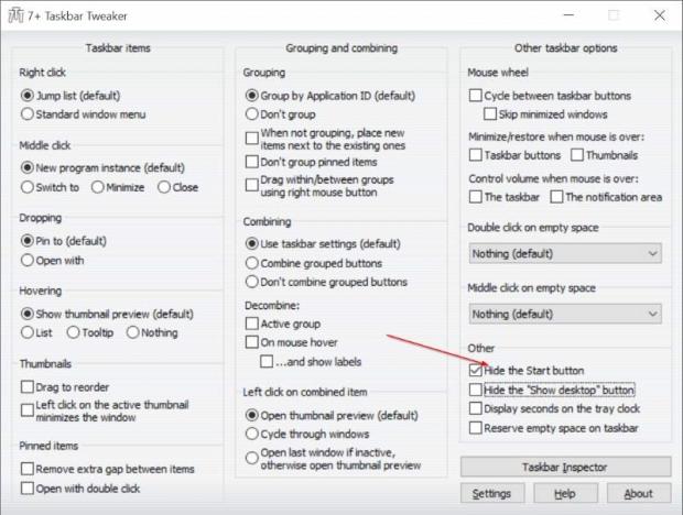 Nút Start nằm bên trái thanh Taskbar. Mục đích khi tích hợp nút Start là để hỗ trợ người dùng mở Start Menu bằng cách nhấn phím Windows. Giả sử vì một lí do nào đó mà bạn muốn ẩn nút Start này đi, bạn có thể sử dụng công cụ miễn phí 7+ Taskbar Tweaker For Windows 10.