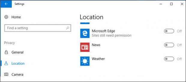 Privacy -> Location' width='650' height='286'> Tìm Microsoft Edge trong danh sách và đặt tính năng chia sẻ vị trí là