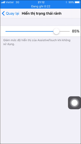 Tại giao diện Assistive Touch bạn nhấn vào Độ mờ khi không dùng. Xuất hiện thanh ngang điều chỉnh mức độ hiển thị cho phím Home ảo. Bạn điều chỉnh các mức độ trong suốt của nút Home ảo tùy thích, bằng cách đưa con trỏ trắng sang phải hoặc sang trái. Con trỏ càng về bên phải thì độ nét của phím Home càng tăng. Ngược lại, khi con trỏ về bên trái, hay thậm chí xuống mức thấp nhất 15%, nút Home ảo được làm mờ hoàn toàn, hầu như không nhìn thấy gì.