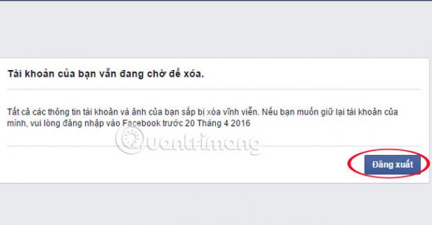 Bước 7: Xuất hiện cửa sổ mới. Facebok sẽ thông báo các thông tin về việc xóa tài khoản. Nhấn Đăng xuất để hoàn thành các thao tác khóa Facebok vĩnh viễn.
