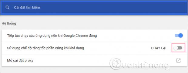 Chuyển sang giao diện Hệ thống với các tùy chỉnh khác nhau. Bạn hãy tắt tùy chọn Sử dụng tăng tốc phần cứng khi khả dụng ( Use hardware acceleration when available). Cuối cùng bạn cũng khởi động lại trình duyệt Chrome để các thay đổi trên có hiệu lực.