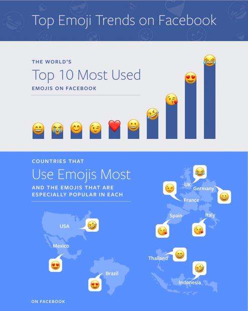 Nhân dịp kỷ niệm ngày World Emoji Day, Mark Zuckerberg (đồng sáng lập Facebook) đã công bố danh sách những mặt cười (Emoji) được chúng ta sử dụng nhiều nhất trên mạng xã hội này. Theo đó, biểu tượng cười ra nước mắt đứng đầu bảng xếp hạng, tiếp đó là biểu tượng đôi mắt long lanh hình trái tim. Đa số những thứ hạng tiếp theo đều có nội dung gần giống như vậy, nhìn đâu cũng thấy nụ cười, tình yêu (trái tim) và nước mắt. Hoàn toàn không có các biểu tượng giận dữ, ngạc nhiên hay các biểu tượng nào khác.