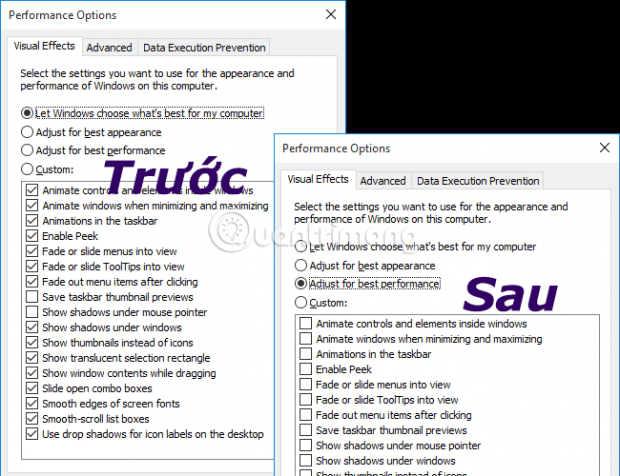 Cách đây nhiều năm Windows XP ra đời mang theo rất nhiều cải tiến và hy vọng của Microsoft về tham vọng thống trị thị trường máy tính để bàn. Và Windows XP đã thực sự làm được điều mà khó hệ điều hành nào có thể làm được trong quãng thời gian đó. Từ Windows 98 trở về trước đó thì người dùng không có sự lựa chọn nào trong việc dùng và tùy chỉnh Windows, nhưng với Windows XP thì đã khác, khác rất nhiều. Bên cạnh việc đổi giao diện thì ưu tiên hiệu suất hoạt động hay giao diện đồ họa cũng giúp người dùng có nhiều trải nghiệm thú vị. Trở lại với Windows 10, để tăng hiệu suất hoạt động của hệ điều hành mới này, các bạn mở System > Advanced system settings (có thể mở bằng nhiều cách) > Advanced > bấm nút Settings trong phần Performance: