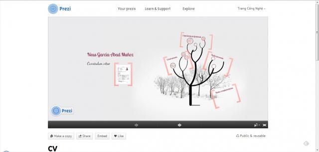 Nhưng tôi khuyên bạn nên mở tab Explore, và sau đó gõ vào ô tìm kiếm với keyword: 'CV' hay 'Curriculum Vitae' và nhớ tick vào ô Show only reusable prezis (chỉ hiện những prezi dùng lại được), có hơn 1000 prezi được tìm thấy, việc của bạn bây giờ là chọn cái nào mình thấy đẹp và ưng ý nhất. Điều đặc biệt ở cộng đồng Prezi là bạn được thỏa sức edit sản phẩm của các thành viên khác thành sản phẩm của mình mà không bị kiện vì vi phạm 'quyền tác giả'.