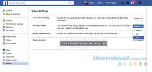 Một trong những địa chỉ mà bạn nhìn thấy video tự động phát nhiều nhất là trên Facebook. Nó được thiết kế theo cách mà các video bắt đầu phát ngay khi bạn lướt qua chúng. Bạn có thể vô hiệu hóa điều này trong cài đặt cài khoản của mình. Click vào mũi tên hướng xuống dưới ở bên phải của thanh trình đơn trên cùng của trang và nhấp vào