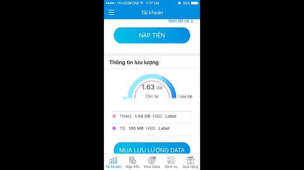 Để kiểm tra trên sim MobiFone, bạn hãy tải ứng dụng MobiNext để kiếm tra dung lượng, như hình dưới: