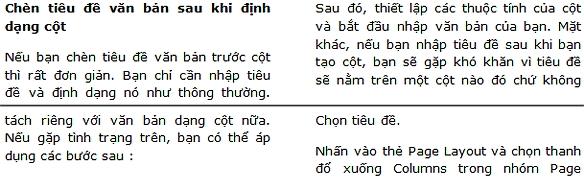 Nếu bạn chèn tiêu đề văn bản trước khi tạo cột thì rất đơn giản. Bạn chỉ cần nhập tiêu đề và định dạng nó như thông thường. Sau đó, bạn tiến hành tạo cột và bắt đầu nhập văn bản. Mặt khác, nếu nhập tiêu đề sau khi tạo cột, bạn sẽ gặp khó khăn vì trong một số trường hợp tiêu đề sẽ nằm trên một cột nào đó chứ không tách riêng với văn bản dạng cột nữa. Nếu gặp tình trạng trên, bạn có thể áp dụng các bước sau :