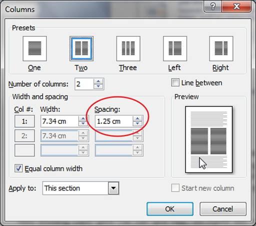 Nếu khoảng cách giữa các cột quá hẹp, người đọc có khả năng đọc tiếp một dòng từ cột này sang cột kế tiếp luôn thay vì đọc nội dung từ cột này đến cột khác. Do đó để điều chỉnh khoảng cách giữa các cột cho thích hợp, bạn có thể chọn More Columns từ thanh đổ xuống Columns (trên thẻ Page Layout). Đối với Word 2003, chọn Columns từ thực đơn Format. Sau đó điều chỉnh khoảng cách giữa các cột tại mục Spacing.