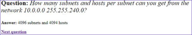 Câu hỏi chia mạng con trên Subnettingquestions.com Câu hỏi được đưa ra dưới dạng text, bạn không có chỗ để nhập câu trả lời, chỉ có thể nhẩm câu trả lời trong đầu, sau đó nhấp vào Reveal answer để xem câu trả lời của mình có đúng không. Theo đánh giá của mình thì bài tập, câu hỏi trên trang này khá cơ bản. Phù hợp với các bạn mới học về chia mạng con. Các bạn còn biết nguồn nào để luyện tập mảng này thì bình luận bên dưới bài viết để chia sẻ cho những bạn đọc khác nhé. Chúc các bạn học hành, công tác thuận lợi nha!