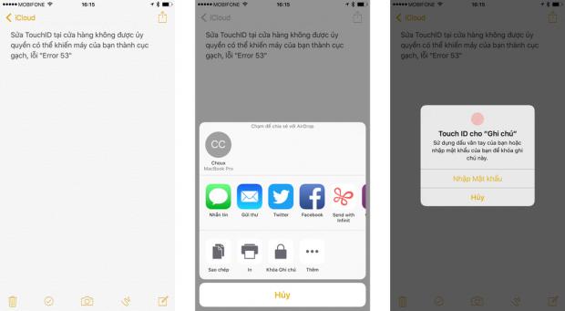 Có rất nhiều người than phiền với mình là ứng dụng Notes của Apple không đủ bảo mật, họ ghi nhật ký trong đó mà mở ra ai cũng được đọc thì không hay. Lên tới iOS 9.3, điều này không còn nữa nhờ vào tính năng khóa note mới. Bạn có thể xài passcode hay vân tay để mở khóa đều được hết, tất nhiên mình thường xài vân tay cho nhanh gọn lẹ, chạm vô một cái là xong. Cái hay ở đây đó là tính năng này không khóa cả app lại mà chỉ khóa những ghi chú do bạn chỉ định mà thôi, vậy nên những ghi chú không quan trọng thì không cần lock làm gì cho mất thời gian mà lại khó tìm kiếm về sau.
