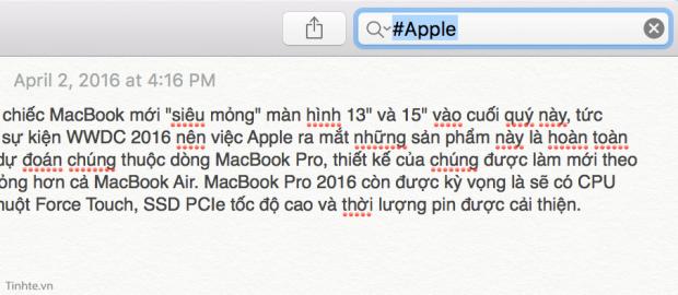 Mặc định Apple Notes không hỗ trợ tính năng tag, không có bất kì thể loại nào để gắn tag hết. Tuy nhiên, chúng ta vẫn có thể khéo léo xài dấu # kèm theo từ khóa để gắn tag, như vậy thì khi dùng Notes hay Spotlight để tìm kiếm thì sẽ nhanh hơn rất nhiều. Bạn có thể đánh tag thẳng vào dòng đầu tiên của ghi chú luôn chứ không có ô riêng gì để nhập vào cả. Mình thường hay kết hợp nhiều tag lại để tìm chính xác hơn, ví dụ #Apple #Tinhte #smartphone khi mình viết cái gì đó có liên quan tới Apple, hay #phanmem #ketoan lúc mình việc với sản phẩm của công ty.
