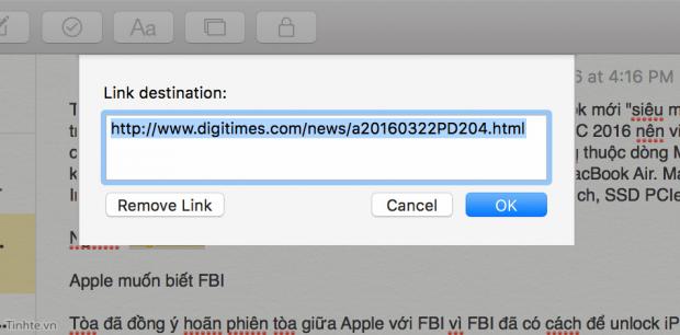 Tính năng này không mới, nhưng sẵn tiện thì đề cập luôn cho anh em biết. Khi đang ghi chú bằng Notes, bạn có thể chọn nhanh đoạn văn bản muốn nhúng link, sau đó ấn Command + K để mở hộp thoại và dán link mong muốn vào là xong. Tính năng này tương tự như là hyperlink bên Word hay Evernote vậy. Trên iOS thì mình chưa mò ra cách chèn link, bạn nào biết thì chia sẻ với mình nhé.