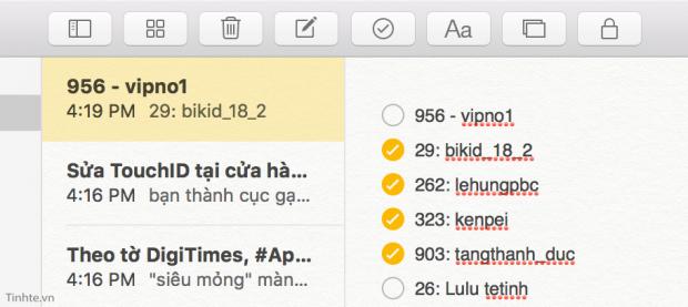 Danh sách việc cần làm sẽ trở nên dễ quản lý hơn rất nhiều nếu bạn chèn thêm mấy ô tròn vào để đánh dấu những việc đã hoàn thành. Thực chất chuyện này cũng giống như việc bạn ghi chú ra giấy, xong cái gì thì gạch bỏ cái đó đi. Dấu tròn này có cho cả trên iOS lẫn OS X, bạn chỉ cần bấm vô là có ngay. Lúc bạn nhấn Enter để tạo dòng mới thì dấu tròn cũng sẽ được chèn sẵn cho bạn nên chỉ cần nhấn 1 lần duy nhất mà thôi. Lỡ như bạn muốn đang xen ghi chú dạng checkbox với ghi chú chữ bình thường cũng được, khi đó bạn ấn lại vào nút checkbox để tắt nó đi.