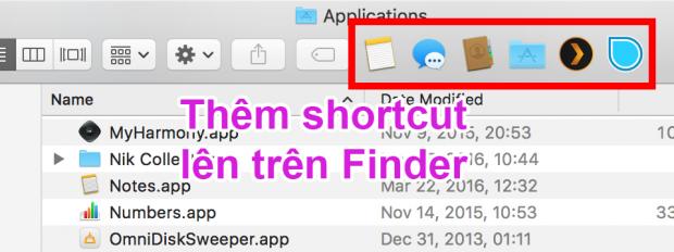 Nếu bạn làm việc nhiều với Finder và có nhiều app dùng thường xuyên thì có một cách để đưa các app đó lên phía trên thanh công cụ của Finder. Cách làm rất đơn giản, nhấn giữ nút Command rồi kéo icon của app đó lên thanh công cụ, xong. Có thể áp dụng cả với các thư mục và file thông thường. Để xóa, bạn cũng nhấn giữ Command rồi kéo shortcut đó ra khỏi thanh công cụ.