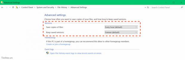 - Ở dòng 'Save copies of files', chỉnh lại các thời điểm sao lưu là mỗi 3 hoặc 6 giờ tùy nhu cầu của bạn. Có thể chọn chỉ sao lưu cuối mỗi ngày thôi cũng được. Lưu ý là nếu bạn rất cần File History để liên tục quay lại các bản backup của mình thì nên để cho thoải mái, ưu tiên phục vụ công việc của chúng ta cái đã. Chỉ khi nào bạn ít xài đến hay thậm chí là lâu lâu mới cần tới File History thì backup mỗi ngày cũng đã đủ rồi.
