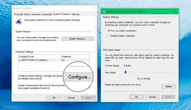 8. Chỉnh lại dung lượng lưu trữ của System Restore
