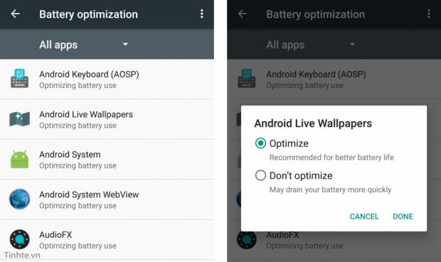Doze hay đấy, nhưng nó có thể làm gián đoạn một số ứng dụng quan trọng không theo mong muốn của bạn, từ đó khiến tính năng không được chạy đầy đủ. Nếu gặp tình trạng này, bạn có thể yêu cầu Android 6.0 không áp dụng Doze cho tối đa 3 app mà bạn thích. Những ứng dụng có thể nghĩ đến đó là app download phim, ứng dụng tải nhạc chạy nền, thậm chí là cả Google Play Store và Facebook. Lưu ý, bạn không cần phải add ứng dụng tin nhắn và gọi điện vì mặc định Doze đã có cơ chế để xử lý SMS và cuộc gọi nhằm đảm bảo bạn không bỏ lỡ bất kì tin quan trọng nào cả.