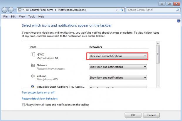Để ẩn thông báo. Trong Control Panel, chọn All Control Panel Items và tiếp tục chọn notification area. Duyệt qua danh sách liệt kê để tìm mục GWX (Get Windows 10) và thiết đặt lại tùy chọn Hide icon and notifications trong mục Behaviors. Nhấn OK để xác nhận thay đổi.