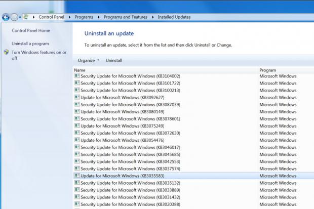 Trong Control Panel, chọn System and Security, nhấn chọn mục Windows Update và nhấn chọn mục View installed updates ở bên trái giao diện màn hình sau đó. Tương tự trên, duyệt qua danh sách liệt kê các gói cập nhật đã cài đặt để tìm KB3035583, nhấn phải chuột và chọn Uninstall nó.