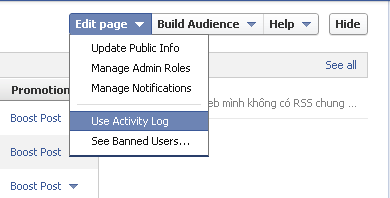 Đối với fanpage, bạn click vào nút Edit page ở góc trên bên phải màn hình, chọn 'Use Activity Log' trong trình đơn sổ xuống và thực hiện tương tự bước ở trên.