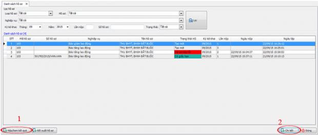 Bước 2: Tiến hành lọc hồ sơ cần tra cứu, chọn nút Nộp/Xem kết quả để xem chi tiết thông tin và kết quả trả về từ cơ quan BHXH. Còn xem lại chi tiết bộ hồ sơ đó, chọn Chi tiết.