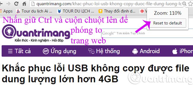 Nếu cảm thấy phông chữ trang web đang xem quá nhỏ hay quá lớn, bạn có thể nhấn, giữ phím Ctrl rồi xoay nút cuộn chuột lên hoặc xuống để thay đổi phông chữ. Xoay nút cuộn chuột xuống sẽ làm phông chữ nhỏ đi còn xoay lên sẽ làm phông chữ lớn lên.