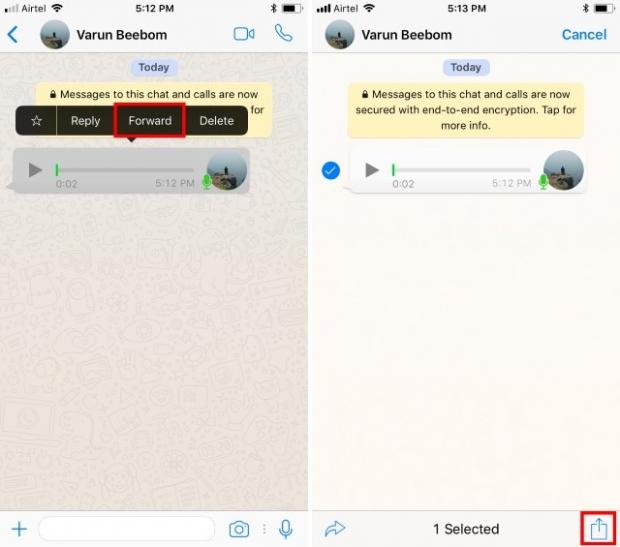 Bây giờ khi Transcriber đã được thiết lập, mở phần trò chuyện có tin nhắn thoại trong WhatsApp mà bạn muốn chuyển đổi. Bấm và giữ tin nhắn thoại để chọn. Sau đó, nhấn vào biểu tượng chia sẻ ở thanh trên cùng. Từ danh sách các tùy chọn xuất hiện, chọn '