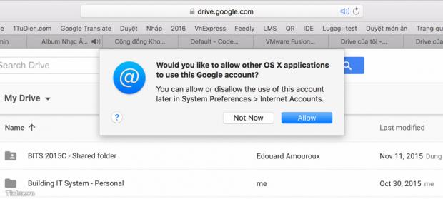 Khi bạn truy cập vào các trang Gmail, Google Drive, nói chung là mấy trang web của Google, hoặc vào Facebook bằng Safari, trình duyệt sẽ hỏi bạn có muốn đồng bộ tài khoản này với máy Mac hay không. Ví dụ, với Gmail, nếu bạn chọn OK, thông tin của tài khoản sẽ được tự động add vào OS X, vậy là bạn đã có thể xài email, sync danh bạ, tin nhắn với máy tính mà không cần làm thêm bước add tài khoản thủ công. Mình cực kì thích chức năng này, nhất là khi mới cài lại máy vì bạn chỉ cần nhập 1 lần mà sync được cho tới 2 nơi, quá tiện lợi.