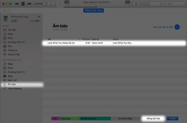 Thực hiện kéo thả tệp tin .m4r vừa tạo vào giao diện chính của iTunes. Sau đó bạn vào tùy chọn Âm báo và nhấn vào Đồng bộ hóa. Đợi quá trình hoàn tất, iPhone của bạn đã có thể kích hoạt nhạc chuông đó làm âm báo.