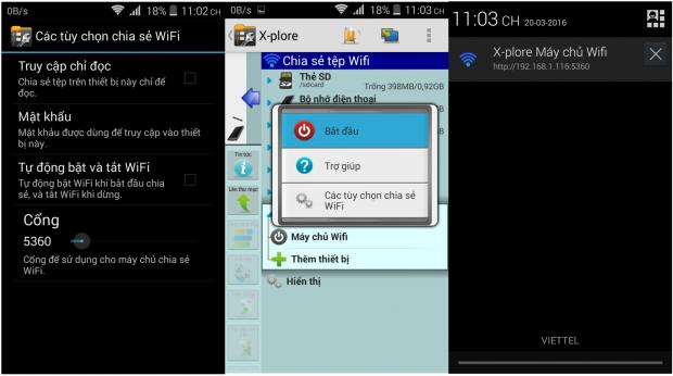 Để setup không dây cần phải làm: Cài đặt X-plore > Các tùy chọn chia sẻ Wifi > Phần “Mật khẩu” : các bạn tự chọn và nhớ mật khẩu ,Phần “Cổng” : chọn 4 số bất kì xxxx . Quay lại trang chủ ứng dụng và chọn : Chia sẻ tệp Wifi > Máy chủ Wifi > Bắt đầu.
