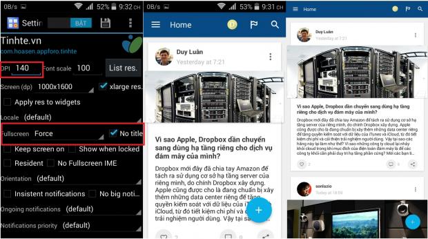 Các bạn có thể thấy app Tinhte.vn hiển thị Fullscreen và chứa rất nhiều nội dung do mình chỉnh lại DPI =140 và để hiển thị toàn màn mình 'Force Fullscreen'.