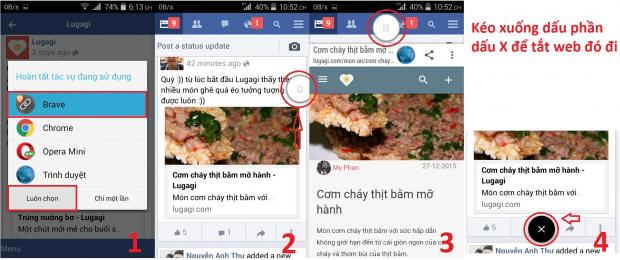 Khi đang lướt Facebook mà bạn muốn vào một link nào đó ở dạng cửa sổ ChatHead thì chỉ cần: Click vào link > Chọn Brave (Hình1) > Luôn chọn > Trang Web của bạn sẽ ngay lập tức được hiển thị dưới dạng ChatHead trên màn hình (Hình2).