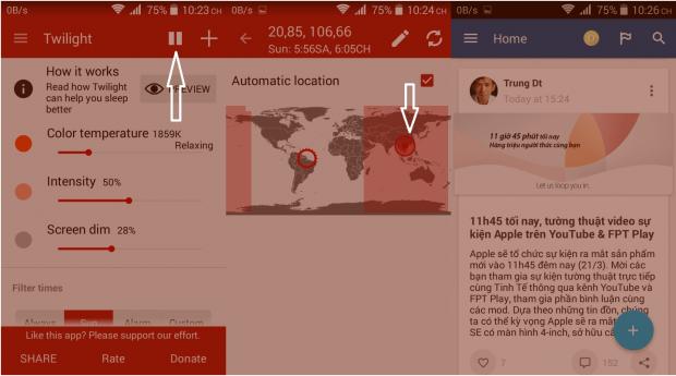 Với Twilight bạn có thể đặt thời gian cho màn hiển thị bộ lọc màu. Mình thường đặt từ 10:30 tới 12:00 và máy tự điều chỉnh nhiệt độ màu màn hình khi tới thời gian đó. Không những vậy, cái đặc biệt của Twilight là còn có thể tự tìm thấy khu vực mình đang sống qua GPS, kiểm tra thời gian là ban ngày hay đêm để đưa ra bộ lọc màu cho hợp lý nhất. Như vậy ta có thể đọc Tinhte.vn vào bạn đêm mà không sợ mất ngủ và chúng ta cũng không cần chờ tới bản cập nhật Android N để tận hưởng tính năng bảo vệ mắt và giấc ngủ này.
