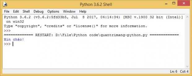 print('Xin chào!') vào file vừa tạo, rồi nhấn Ctrl + S để lưu. File sẽ có đuôi là .py, đặt một cái tên cho nó, chẳng hạn: quantrimang-python.py.