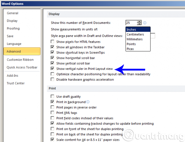 Advanced như hình, tìm đến ô Show vertical ruler in Print Layout view như dưới nhé: