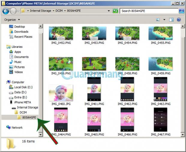 Bước 4: Truy cập vào thư mục ảnh của iPhone Và để copy ảnh từ iPhone sang máy tính, các bạn vào thư mục iPhone > Internal Storage > DCIM > 805AHGFE (tùy từng máy mà tên này có thể khác nhau), lựa chọn ảnh cần thiết và copy ra máy tính như bình thường.