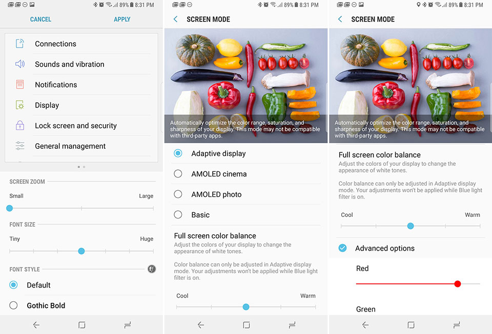 Có bốn chế độ khác nhau để lựa chọn, bao gồm Adaptive, AMOLED cinema, AMOLED photo, và basic. Có một hình ảnh giới thiệu ở trên cùng của màn hình để bạn có thể thấy sự thay đổi màu sắc trông như thế nào ở mỗi chế độ. Chế độ Adaptive sẽ cung cấp cho bạn nhiều tùy chỉnh nhất với các thanh trượt điều chỉnh màu màu nhạt hơn hoặc ấm hơn, thanh trượt cho các kênh màu đỏ, xanh lá cây, và màu xanh (trong phần mở rộng).