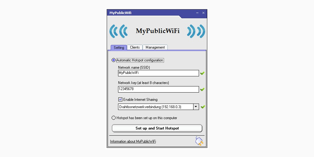 MyPublicWiFi là phần mềm chia sẻ kết nối Internet bằng cách tạo ra một điểm phát WiFi ảo mà các thiết bị khác có thể kết nối tới, dựa trên một quá trình xác thực an toàn. Với MyPublicWiFi máy tính của bạn có thể phát WiFi cho nhiều thiết bị khác một cách dễ dàng và nhanh chóng chỉ sau vài cú nhấp chuột.