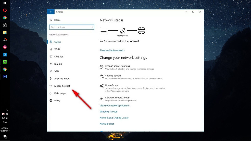 Tại giao diện thiết lập mạng internet, bạn tiếp tục chọn mục Mobile Hotspot ở danh sách bên trái màn hình