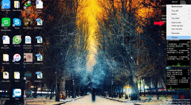Bước 5: Sau khi cài đặt Skin, bạn hãy mở biểu tượng hình giọt nước của Rainmeter ở dưới thanh taskbar lên, hệ thống sẽ hiện ra cho bạn Skin mà bạn đã cài đặt.