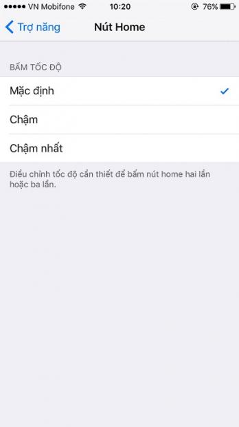 Nếu cảm thấy nút home quá nhạy, bạn có thể chọn vào mục Slow hoặc Slowest, khi đó thì điện thoại sẽ rung lên giữa hai lần nhấp của người dùng. Trở lại màn hình home và xem thử thiết lập nào phù hợp với trải nghiệm khi nhấn nút home của bạn, nhấn chọn vào đó là xong.
