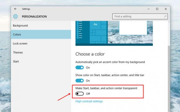 Tiếp theo bạn hãy nhấn vào nhóm tùy chỉnh Colors, sau đó hãy tìm đến tùy chọn Make Start, Taskbar and Action center transparent và gạt sang OFF để vô hiệu hóa.