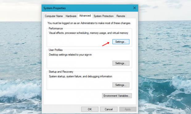 Hộp thoại System Properties xuất hiện, bạn hãy nhấn vào tab Advanced và nhấn vào nút tùy chọn Settings ở nhóm tùy chỉnh Performance.