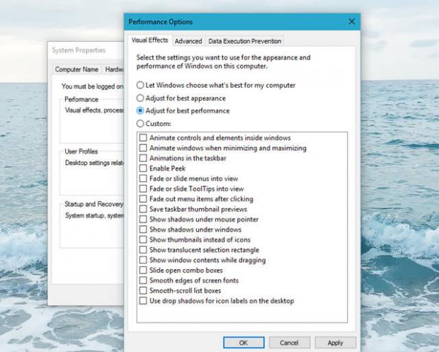 Khi đó hộp thoại Performance Options xuất hiện, bạn hãy đánh dấu vào tùy chọn Adjust for best performance hoặc đơn giản là bỏ đánh dấu ở tất cả các tùy chọn trong phần Custom.