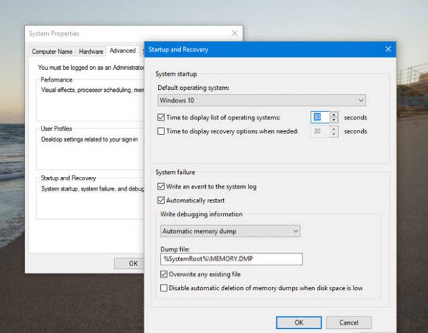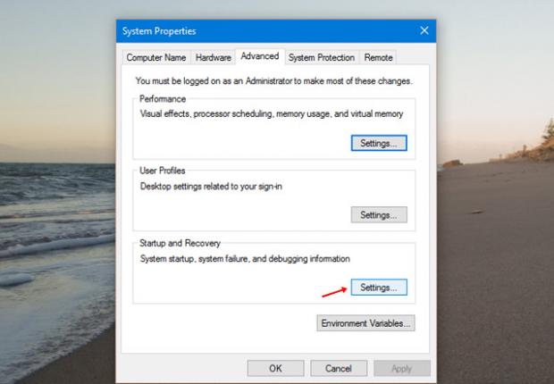 Đây cũng là thủ thuật giúp tăng tốc Windows 10, cụ thể ở đây là thời gian khởi động vào menu boot. Theo mặc định, Windows 10 sẽ có thiết lập thời gian khởi động từ menu boot là 30 giây. Nhưng nếu thích, bạn có thể điều chỉnh lại thời gian này nhỏ hơn bằng cách truy cập vào Control Panel > System > Advanced system settings. Cửa sổ System Properties xuất hiện, bạn hãy nhấn vào tùy chọn Settings ở nhóm tùy chỉnh Startup and Recovery của tab Advanced.