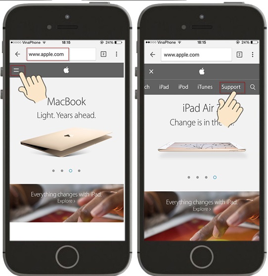 Bước 2: Sau khi đã biết được số imei rồi mình sẽ tiến hành kiểm tra xem iPhone / iPad có phải chính hãng Apple hay không và thời gian bảo hành của máy còn bao lâu. Để kiểm tra bạn vào trang Apple.com và chọn vào biểu tượng 2 dấu gạch bên góc trái màn hình sau đó chọn Support.